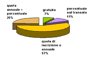 Il 7% offre il servizio in modo completamente gratuito, l'11% richiede una percentuale (generalmente bassa) sulle transazioni che avvengono grazie al contatto on-line, il 57% subordina la partecipazione ad una quota di iscrizione o abbonamento.
